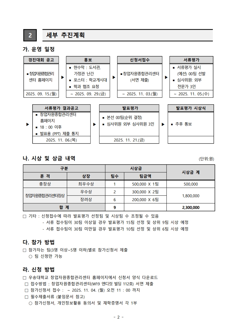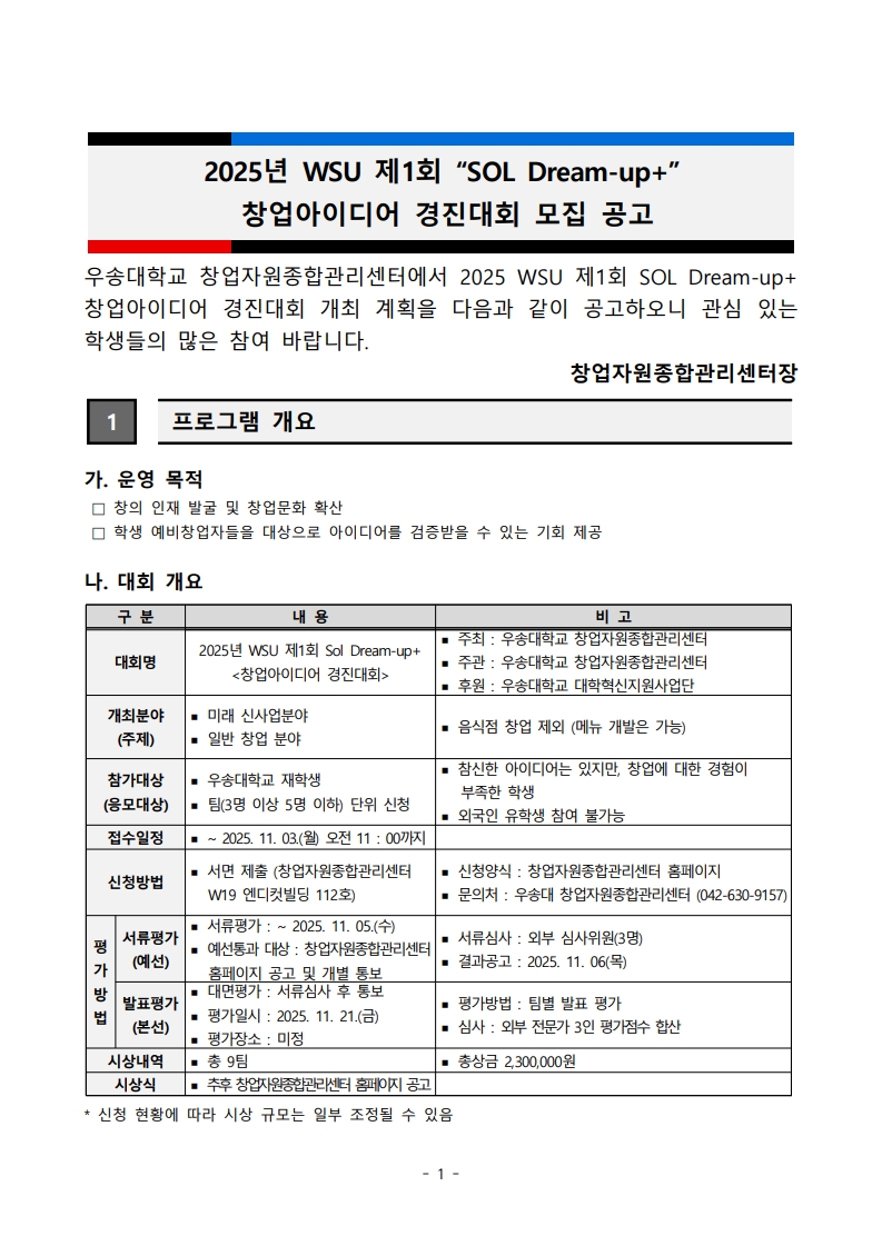 커뮤니티 공지사항 포토갤러리 취업정보 학과뉴스 재학생 Q&A 공지사항Home커뮤니티공지사항 2025 제1회 WSU Sol Dream-up+ 창업아이디어경진대회 모집공고 작성자 : 학과관리자 | 작성일 : 2025.09.23 | 조회수 : 166 첨부파일 붙임1. -복사_1.jpg 붙임1. 2025 제1회 WSU Sol Dream-up+ 창업아이디어경진대회 모집공고-복사_2.jpg [1]붙임1. 2025 제1회 WSU Sol Dream-up+ 창업아이디어경진대회 모집공고-복사_3.jpg [2]붙임1. 2025 제1회 WSU Sol Dream-up+ 창업아이디어경진대회 모집공고-복사_4.jpg [3]붙임1. 2025 제1회 WSU Sol Dream-up+ 창업아이디어경진대회 모집공고-복사_5.jpg [4]붙임1. 2025 제1회 WSU Sol Dream-up+ 창업아이디어경진대회 모집공고-복사_6.jpg 목록 이전글 2025년 2학기 철도운송산업기사 실기시험 특강 안내 다음글 2026학년도 1학기 일본 유학 연수생 모집 안내